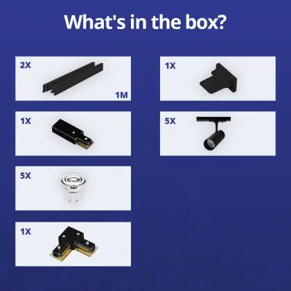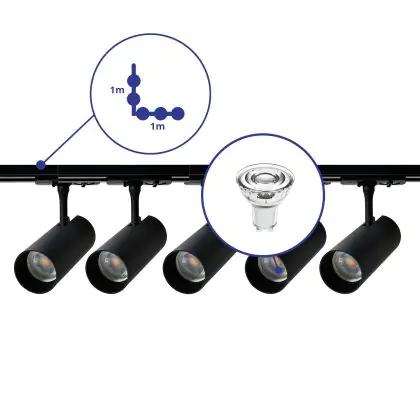 Complete Set 1-Fase Rail L 1 x 1 Meter Zwart | incl. 5x Spot + GU10 2700K 3W Dimbaar + Eindkap, Voedingsconnector en L -Verbindingsstuk