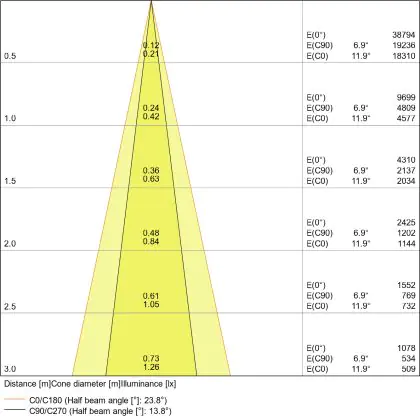 De gradenbundel geeft informatie over hoe breed het licht wordt uitgestraald. Dit zit tussen de 0 en 360 graden (D). Hoe kleiner de hoek, hoe specifieker de lichtbundel is. Over het algemeen is een smalle gradenbundel perfect voor sfeer- of accentverlichting, terwijl een brede gradenbundel ideaal is om grote oppervlaktes te verlichten.